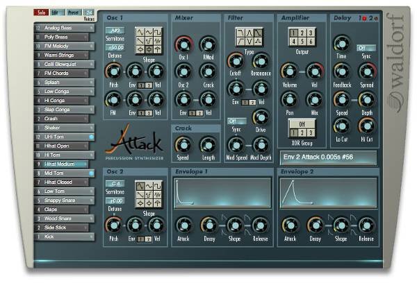 Waldorf Attack Waldorf AttackAttack to syntezator perkusyjny wytwarzający dźwięki na podstawie algorytmów wirtualnej syntezy analogowej. Integruje on brzmienie klasycznych instrumentów analogowych z lat 80. XX wieku i elektronicznych brzmień klubowych lat 90. z wirtualnymi programami-hostami XXI wieku. Wszystkie dźwięki są wytwarzane w czasie rzeczywistym, a przez to istnieje możliwość bezpośredniego dostrajania parametrów i sprawowania kompleksowej kontroli nad brzmieniem. Attack dysponuje 24 instrumentami dostępnymi w obrębie jednego zestawu perkusyjnego, który zajmuje na klawiaturze obszar dwóch oktaw. Architektura brzmienia jest niezwykle elastyczna i sprosta wysokim wymaganiom stawianym przed syntezatorami firmy Waldorf. Źródłem dźwięku są tu dwa oscylatory wytwarzające zarówno klasyczne fale analogowe, jak i trzy różne próbki pomocne przy tworzeniu barw hi-hatu i talerzy. Dodatkowymi modułami odpowiedzialnymi za wzbogacanie brzmienia o charakterystyczną metaliczność są moduły modulatora pierścieniowego i modulatora częstotliwości. Ponadto ulokowano tu moduł „Crack”, który zajmuje się reprodukcją autentycznie brzmiących, analogowych barw typu Hand Clap. Attack dysponuje również rozbudowaną sekcją filtracji z sześcioma typami filtrów, niezwykle wydatnym rezonansem aż do samowzbudzenia oraz możliwością przesterowania do +52 dB. Do dyspozycji mamy ponadto dwa generatory obwiedni, które mogą sterować odstrojeniem oscylatorów, poziomem modulacji FM, częstotliwością odcięcia filtracji oraz poziomem głośności. Przed 6 wyjściami stereo, które łączą instrument ze światem cyfrowym, zapięto dwie linie opóźniające z funkcją modulacji. Pełna integracja z programami-hostami oznacza, że wszystkie parametry mogą być sterowane z pomocą komunikatów MIDI, dzięki czemu bez najmniejszych problemów można uzyskać dynamiczne zmiany brzmienia. Ale na tym nie koniec. W obrębie każdego zestawu perkusyjnego można zapisać do 12 dźwięków melodycznych, dzięki czemu daje się tworzyć nie tylko przejścia na tom tomach, partie congo i inne patterny perkusyjne, ale również ścieżki basowe, melodie i inne dźwięki sekwencyjne. Attack pozwala zatem na tworzenie kompletnych sekwencji bez konieczności korzystania z dodatkowych instrumentów.