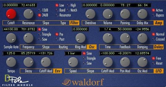 Waldorf D-Pole Waldorf D-PoleFirma Waldorf jest znana w branży jako twórca innowacyjnych syntezatorów, wśród których należy wymienić choćby: MicroWave, awangardowy Wave czy klasyczny, analogowy Pulse. Wszystkie te instrumenty cechuje unikalna, ciepła, analogowa charakterystyka filtrów, dzięki której są one rozpoznawalne i cenione. Pierwszym, całkowicie cyfrowym instrumentem firmy Waldorf był model MicroWave II, w którym osiągnięto to, co do tej pory nie było możliwe: filtr cyfrowy pracował dokładnie tak samo jak jego analogowy odpowiednik dając jednocześnie o wiele większe możliwości. D-Pole to niezwykle muzykalny filtr wykonany w postaci plug-inu, który dysponuje takimi samymi możliwościami, jak jego odpowiednik sprzętowy. Dzięki temu nic nie stoi na przeszkodzie, aby filtrować wokal korzystając z 5 typów filtracji czy przekształcić prostą pętlę akustyczną w mocny groove taneczny przy użyciu LFO, który daje się sprzęgnąć z tempem podawanym przez program-host. Można też dodać przester do partii gitarowej, a nawet uzyskać charakterystyczne, modulowane z pomocą modulatora pierścieniowego brzmienie, które następnie można przepuścić przez stereofoniczną linię opóźniająca w celu dalszych eksperymentów. D-Pole pozwala tworzyć zupełnie nowe efekty dźwiękowe w ciągu kilku sekund, dzięki możliwości sterowania parametrami w czasie rzeczywistym. Wszystkie istotne parametry dają się zautomatyzować, a ustawienia można zapisać jako pojedyncze programy lub banki. D-Pole to niezwykle kreatywne narzędzie dające bezmiar możliwości!