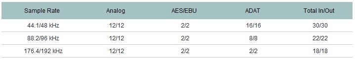 RME Fireface UFX oferuje 60 kanałów audio, 30 wejść / 30 wyjść. Wszystkie wejścia i wyjścia mogą być użyte jednocześnie umożliwiając zapis z 12 analogowych oraz 18 cyfrowych kanałów na 30 osobnych śladach dowolnego rejestratora wielośladowego. Poniżej ilość dostępnych kanałów w zależności od wybranej częstotliwości próbkowania.