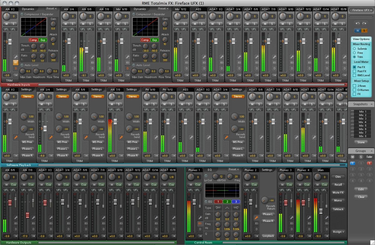 Zaawansowane opcje routingu TotalMix FX, jego elastyczność oraz sekcja efektów sprawiają, że ta aplikacja w połączeniu z Fireface UFX z powodzeniem mogą zastąpićmikser i być "centrum dowodzenia" dowolnej konfiguracji scenicznej lub studyjnej. Gotowe ustawienia TotalMix FX można zapisać w 6 komórkach pamięci i wywołać je w ułamku sekundy z poziomu TotalMix FX w komputerze lub z poziomu Fireface UFX nawet przy wyłączonym komputerze(!). Aplikacja TotalMIX może byćrównież sterowana za pomocą zewnętrznego kontrolera midi zgodnego z Mackie Control.