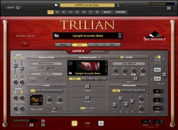 Spectrasonics TRILIAN [Total Bass Module] to nowa propozycja Erica Pershinga oferująca całe spektrum brzmień basowych.34 gigabajty starannie wyselekcjonowanych sampli, nagranych z różną artykulacją [staccato, legato, sustain, vibrato, slide up, slide down] i przy różnej głośności umożliwią stworzenie bardzo skomplikowanych aranżacji basowych. Jest to pierwszy instrument umożliwiający oddanie najdrobniejszych niuansów brzmieniowych charakterystycznych dla instrumentów basowych. Wydajność i pełna integracja Trilian jest napędzany przez nowoczesny silnik STEAM Engine - ten sam, który po raz pierwszy został zastosowany w nagrodzonym MIPA2009 instrumencie zwanym Omnisphere. Przy tak obszernej bibliotece dźwięków ważne jest by wszelkie operacje przełączania i wyszukiwania barw odbywały się szybko. Dzięki temu samemu silnikowi Trilian perfekcyjnie integruje się z Omnisphere. Możliwe jest ładowanie barw Triliana z poziomu Omnisphere i przepuszczenie ich przez cały tor syntezy oraz efektów tego syntezatora. Pełna integracja umożliwia również zastosowanie Triliana do odgrywania partii basowych przy grze na żywo podczas gdy sekwencje syntezatorowe będą pochodzić z Omnisphere.