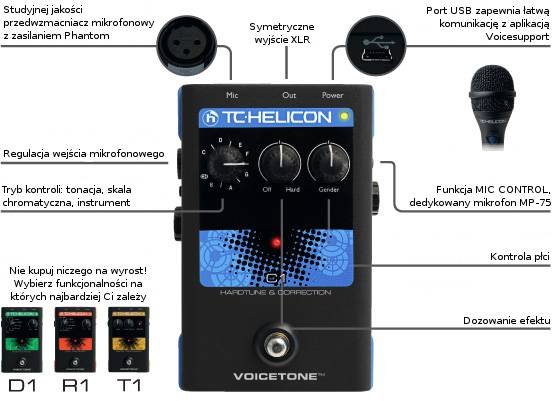 To zadziwiające jak wiele może zmieścić się w tym maleństwie. Kostka C1 oferuje każdemu wokaliście, w każdych warunkach -bezkompromisowo czyste brzmienie. Voicetone C1 zapewnia subtelną korekcję tonacji oraz popularny na całym świecie efekt Hardtune, czyli charakterystyczny poszarpany wokal, bez którego trudno wyobrazić sobie współczesne nagrania R&B czy hip-hop. Efekt, zapewnia zawodowe brzmienie na scenie przy minimalnym nakładzie starań ze strony użytkownika, a wszystko - dobrze, szybko, powtarzalnie a przede wszystkim bezawaryjnie.