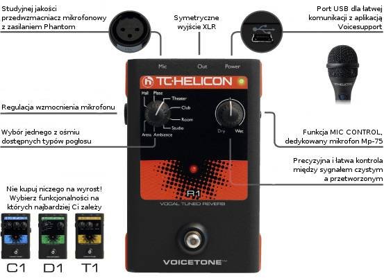 Najprostszy procesor pogłosowy jaki kiedykolwiek miałeś okazję używać. Skoncentruj się na tym, co najważniejsze podczas występu! Dzięki kostce Voicetone R1, wzbogacimy nasze sceniczne występy o najwyższej jakości pogłos [zaczerpnięty z flagowego procesora VoicePro], dotąd możliwy do uzyskania jedynie w warunkach studyjnych. Osiem dostępnych typów pogłosu oraz w pełni uniwersalny charakter tych efektów, sprawia że ujęcie publiczności imponującym wokalem nigdy nie było prostsze!